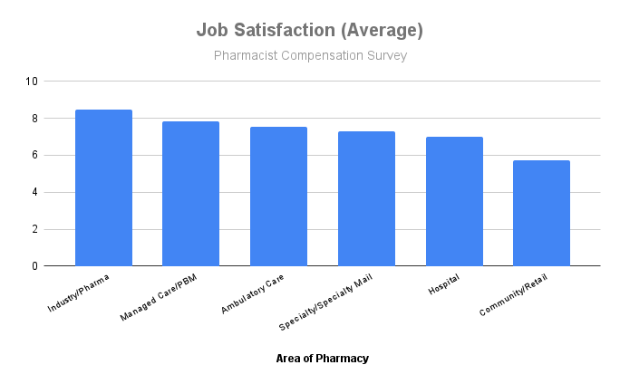 Pharmacist Compensation surveyed 3,750+ pharmacists on job satisfaction. The scale was from 0 (lowest satisfaction) to 10 (highest satisfaction). All the above areas of pharmacy have a minimum of 100 participants.
