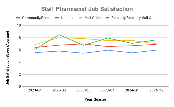 Pharmacist Compensation analyzed data from Staff Pharmacists over the last six quarters (Q1 2023 - Q2 2024) in various settings. Earlier comments about job satisfaction in the retail pharmacy setting was not speculation. It was confirmed in the data. Compared to other settings, retail pharmacists consistently reported the lowest job satisfaction in every quarter. Moreover, the job satisfaction score never cracked a score of 6 (out of 10 being highest satisfaction).