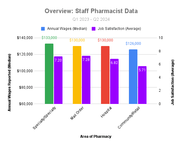 Combining all six quarters into one graph doesn’t impact the storyline. Over this timeframe, staff pharmacists from the retail setting reported the lowest median annual wages and lowest job satisfaction.