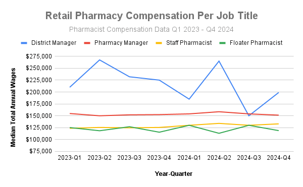 The graph displays a quarterly breakout of retail pharmacist participants by job title. Data collected by Pharmacist Compensation in 2023 and 2024.