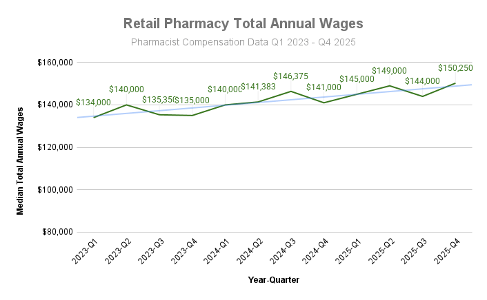 The above graph displays median annual wages as reported by retail pharmacists. Total annual wages was defined as the sum of base salary, overtime, and bonus(es). Data collected by Pharmacist Compensation beginning January 2023 through the end of 2025.